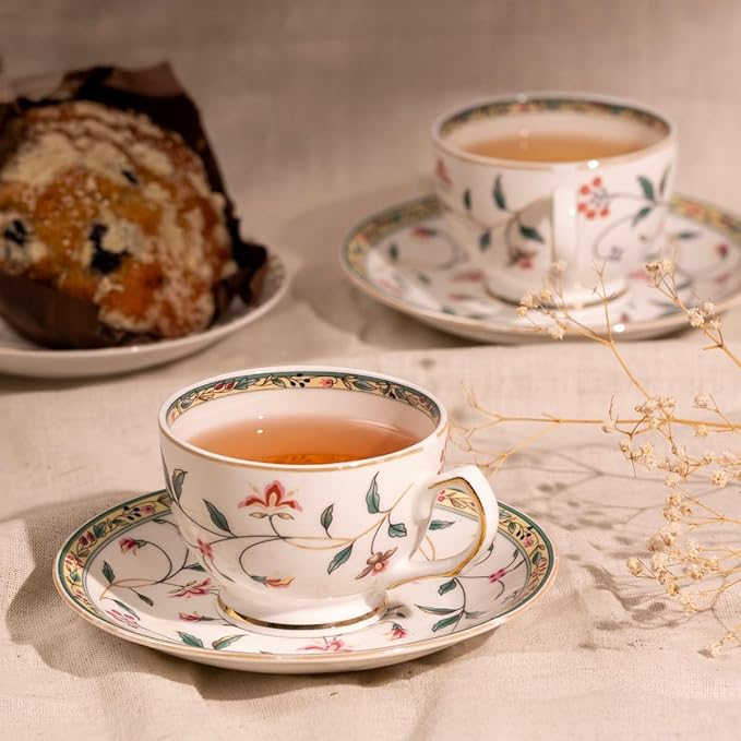 GOLDEN QUEEN’S Cup Saucer Set | Perfect for Hosting & for Tea/Coffee | Handcrafted in India | 24-Carat Gold Details | 6 Cups, 6 Saucers & 6 Spoons | 170 ml – Leafy Blush & Pink Charm
