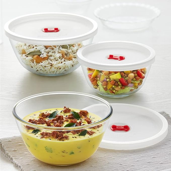 Borosil Glass Serving Bowls With Lids, Oven & Microwave Safe Bowls, Set of 3 (500 ml + 900 ml + 1.3 L), Borosilicate Glass, Clear