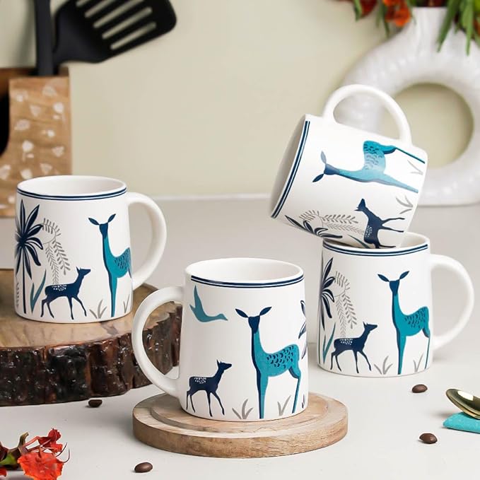 The Earth Store Stag Blue Coffee Mug Set of 4 to Gift to Best Friends, Coffee Mugs, Microwave Safe Ceramic Mugs,(300 ml Each)