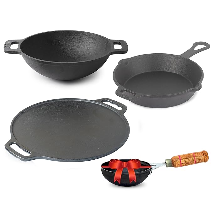 The Indus Valley Pre-Seasoned Cast Iron Cookware Set+ Free Tadka Pan|Tawa (30.5 Cm)+ Kadai (25.4 Cm/2.3L)+ Fry Pan (23 Cm/1.4L)|Kitchen Cooking Combo Pots & Pans Set Of 4Pcs|Naturally Nonstick – Black