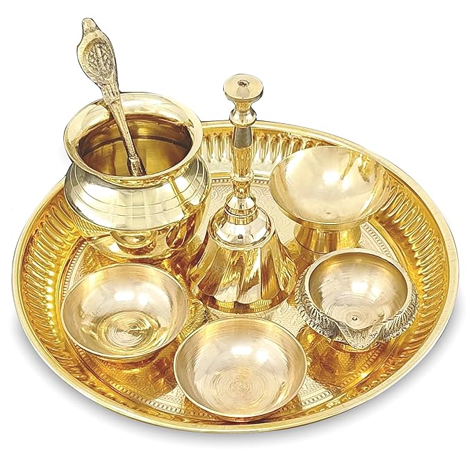 BENGALEN Brass Pooja Thali Set Small 6 Inch Puja Thali with Pital Plate Chandan Wati Kalash Kuber Diya Ghanti Palli Arti Thali for Diwali Home Office Mandir Wedding Return Gift Items