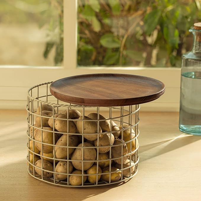 Kitchen Vegetable Storage Basket with Wooden Lid, Fruit Basket for Pantry, Countertop Multi-Functional Fruit & Vegetable Organizer for Home & Kitchen Décor