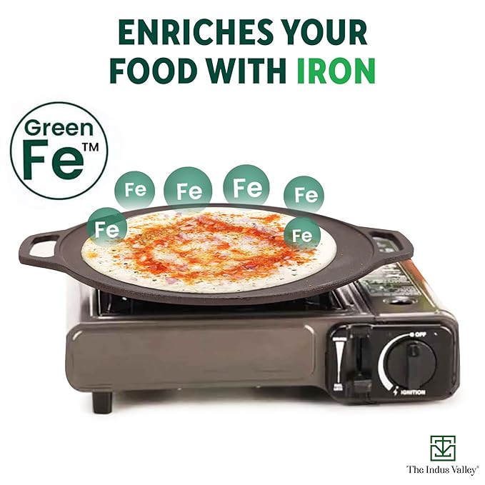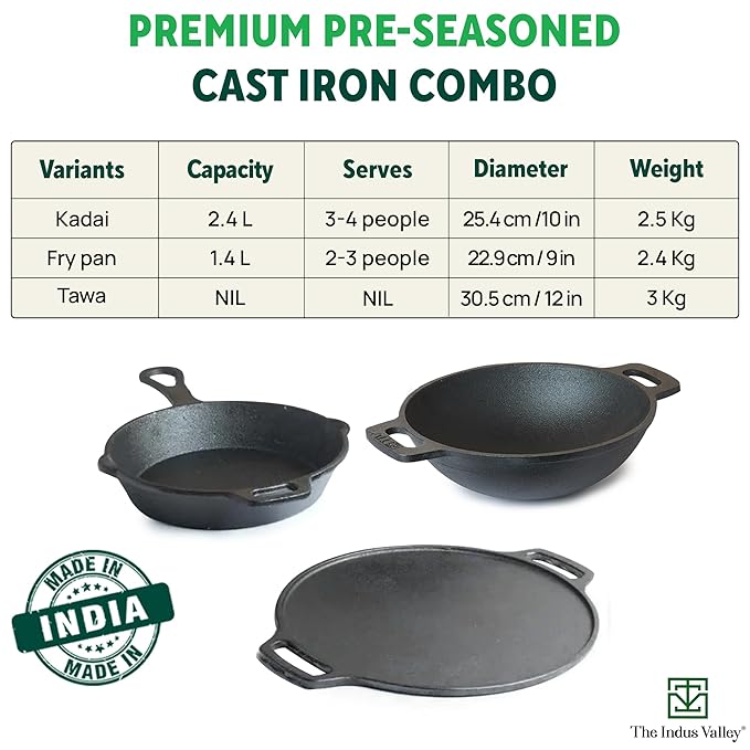 Food cooked in cast iron has a unique, earthy depth of flavor that cannot be replicated by stainless steel or aluminum pans. Whether you are preparing crispy dosas, perfectly charred rotis, spicy curries, or Western classics like steaks and sautéed vegetables, this cast iron cookware set enhances the aroma and taste.