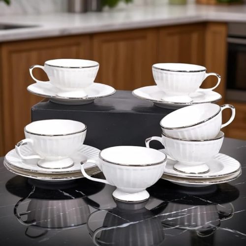 Bring home the charm of timeless elegance with this 18-piece Cup Saucer Set – including 6 cups, 6 saucers, and 6 spoons, crafted with precision using high-quality fine bone china. Designed to be both luxurious and durable, this set transforms every tea or coffee break into a delightful experience. Whether you are hosting guests, enjoying family time, or having your personal chai break, these cups and saucers add a touch of class to every sip.