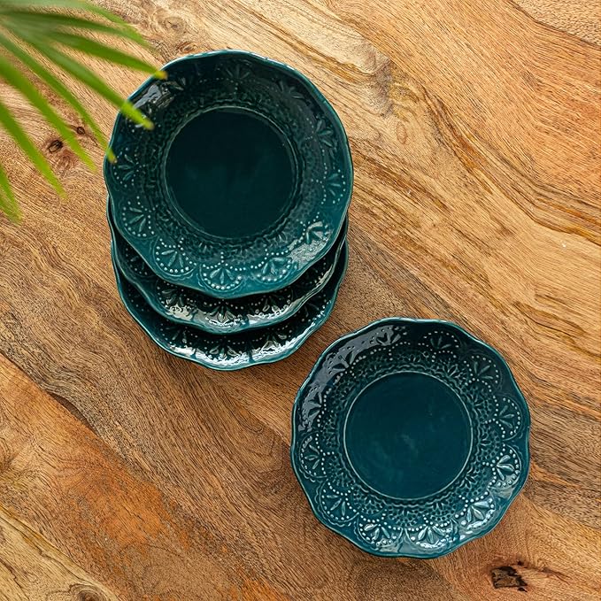 ExclusiveLane 'Teal Forest' Hand Glazed Ceramic Plates for Dinner Set of 4 (Dishwasher & Microwave Safe Plates) | Hand-Etched Quarter Plates Set Dinner Plates Snacks Plates Ceramic Serveware